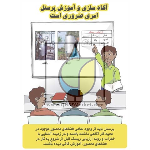 متن پوستر: آگاه سازی و آموزش پرسنل امری ضروری است - پرسنل باید از وجود تمامی فضاهای محصور موجود در محیط كار آگاهی داشته باشند و در زمینه آشنایی با خطرات و روند ارزیابی ریسك قبل از شروع به كار در فضاهای محصور، آموزش كافی دیده باشند.